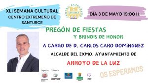 Dió comienzo nuestra Semana Cultural con el Pregón a Cargo de Sr. D. Carlos Caro Domínguez, alcalde de la localidad Cacereña de Arroyo de la luz. Fue un acto muy