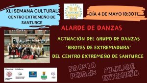 18:30h.- Alarde de danzas con nuestro grupo de baile Brotes de Extremadura en nuestros locales sociales, nos presentó una muestra del gran folclore Extremeño.